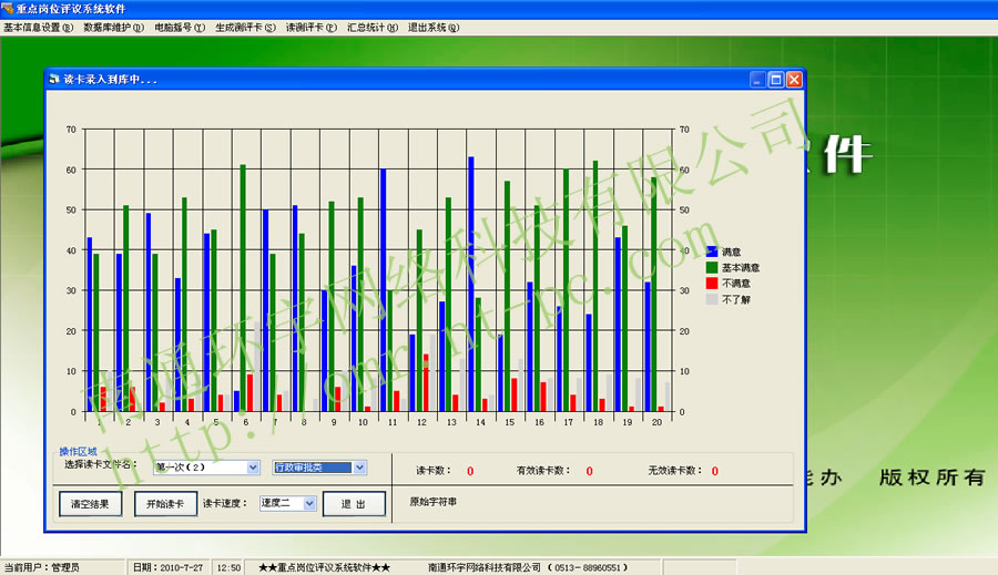 随着考评体系的进一步完善,给统计汇总工作增加了较大难度,而传统的统计工作时间紧、工作量大、要求高、效率低。现代计算机的应用(软件+硬件的模式)彻底扭转了这种不利的局面,实现了机关岗位信息管理工作的规范化、现代化!!由南通环宇网络科技有限公司开发的《重点岗位分类动态评议(测评)统计分析系统》得到了广泛的应用。该考评系统中民主评议表采用机读卡形式,参加考评人员填写的原始考核信息由光标阅读机自动识别读入,后台软件自动统计汇总。系统具有自动构建数据库、统计速度快、准确率高、易管理维护、界面友好等多项优点,有效减轻了工作强度,提高了工作效率,从而提升了考核工作的科学化水平,使得评议过程符合公平、公正、公开的标准。广泛应用于政府各部门及效能办、企业各部门考核测评。